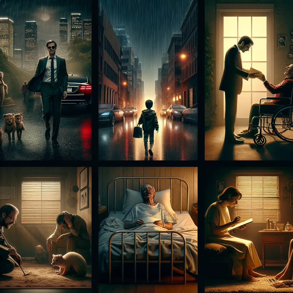 Question: Escriba una historia en la que un CEO atractivo, musculoso, egolatra y narcisista de 23 años, la noche en la que su esposa murio al dar a luz, al ver que el bebe era ciego y debil decidio cambiarlo con el hijo del jardinero que esa noche habia nacido, el CEO cambio los niños sin que nadie supiera, lo hacia porque no iba a permitir que su imperio lo heredara un ciego. Pasaron los años, y el CEO volvio al hijo del jardinero ahora su hijo en un ser cruel y despreciable como el, incluso tanto el CEO y ese joven le hacian bullying y humillaciones constantes al ciego, que era un joven noble y honesto. Y para colmo, el CEO despidio y hecho a la calle al jardinero y al ciego. El jardinero enfermo y murio tiempo despues, el ciego aprendio brailer y salio adelante. Pero la vida, castigaria al CEO de la peor forma, ese joven que el crio lo estafo, le robo todo, incluso a la mujer que era su amante y tiempo despues lo hecho a la calle. El CEO se volvio un vagabundo y cuando fue golpeado por otros vagabundos que lo dejaron tirado, se encontro con el ciego, el ciego sin guardar rencor lo recibio en su casa y lo cuido, el ciego le dijo esto lo hago porque aprendi de mi padre que todos debemos ayudarnos y olvidar todo lo malo, yo a usted lo perdono nunca entiendo que le hice yo para que me odiara tanto.
