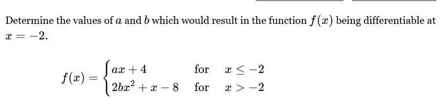 Question: Determine the values of "a" and "b" which would result in the function f(x) being differentiable at x=-2 f(x) = ax-4 for x is less than or equal to -2 f(x) =2bx^2+x-8 for x is greater than -2
