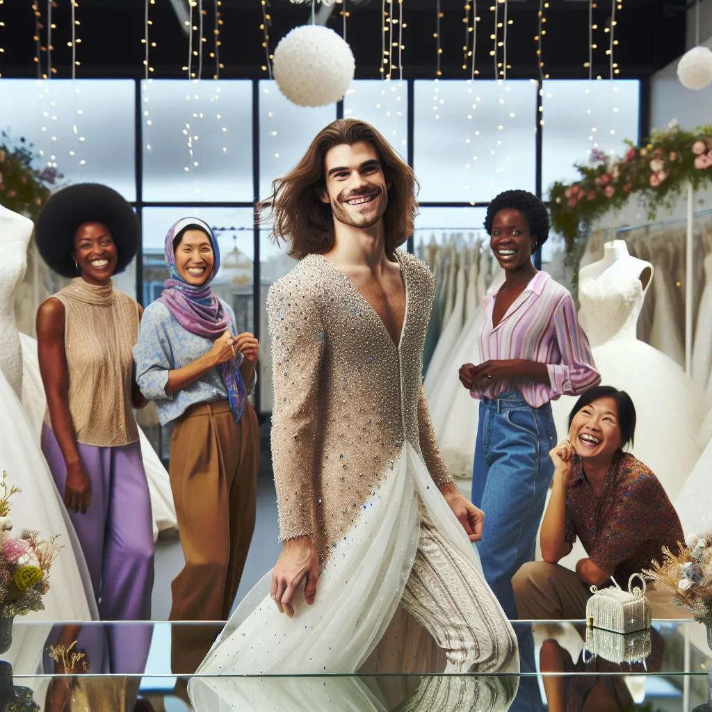 Jake was used to being the helpful little brother. With his sister Emily’s wedding just days away, he’d offered to do any errand—no matter how boring or stressful—to make her day easier. So when she texted, **Can you pick up my dress and accessories from Bella Vogue?** he said yes immediately, promising to bring them home safe and sound. He had no idea he was about to walk into one of the wildest mix-ups of his life. The bridal salon, Bella Vogue, smelled like roses and shimmered with white and cream everywhere he looked. Dresses sparkled behind glass, veils fluttered gently on display stands, and every customer glowed with excitement. “Hi, I’m Jake Elwood,” he told the receptionist. “I’m here to pick up a dress for Emily.” The young attendant’s eyes widened behind her glasses. “Oh! The Elwood wedding party!” she beamed, scribbling something on her clipboard. “Right this way!” Before Jake knew it, she whisked him past rows of gorgeous gowns and into a plush changing suite. Two other staff appeared. “Congratulations!” one said, kindly but firmly tugging off his jacket. “Let’s get you all set up for your final fitting!” Before Jake could clarify, he found himself swept along in their eager professionalism. Shoes off, jacket away, a crisp white corset wrapped around his chest. Silk panties, white stockings rolled up his legs with practiced hands, and then—carefully, reverently—the dress. Layers of satin and lace swished as the staff zipped him in and adjusted the bodice. “I— actually, I’m just—” Jake tried, but the words tangled on his tongue. Did Emily mention she’d send someone? Did they usually do this? But as he looked in the mirror, a strange thrill raced through him. The dress was stunning. The corset gave him a shape he’d never seen before, narrowing his waist and broadening his chest. The veil fell over his face, softening the short brown hair he usually did nothing with. He looked— He looked absolutely amazing. “All set for pictures?” one of the staff asked, holding out Jake’s own phone, which he’d forgotten he’d handed over in the hubbub. Jake grinned, his nerves replaced by a wicked sense of fun. He twirled, he curtsied, he gave his best "bridal smile." The staff happily snapped away. When he checked the photos, he laughed out loud—how was this even him? Quickly, he texted the best picture to Emily. **Hope you don’t mind, I took your fitting for you. Dress fits GREAT.** The reply pinged back almost instantly: **OMG. JAKE WHAT. You look better than me!! ??** Jake beamed at his reflection, imagining Emily’s laughter from miles away. Sure, it was a mix-up. But now, more than ever, he knew he’d do anything to support his sister—and maybe, just maybe, have a little fun along the way.
